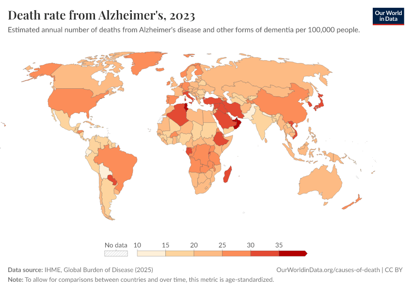 IHME, Global Burden of Disease (2025) – with major processing by Our World in Data. “Death rate from Alzheimer's” [dataset]. IHME, Global Burden of Disease, “Global Burden of Disease - Deaths” [original data]. Retrieved March 11, 2026 from https://gdocs-bespoke-component.owid.pages.dev/grapher/dementia-death-rates