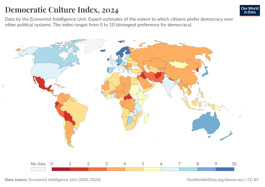 Economist Intelligence Unit (2006-2024) – processed by Our World in Data. “Democratic Culture Index” [dataset]. Economist Intelligence Unit, “Democracy Index 2021: The China challenge”; Economist Intelligence Unit, “Democracy Index 2022: Frontline democracy and the battle for Ukraine”; Economist Intelligence Unit, “Democracy Index 2023: Age of Conflict”; Economist Intelligence Unit, “Democracy Index 2024: What's wrong with representative democracy?”; Gapminder, “Democracy Index v4”; Various sources, “Population” [original data]. Retrieved March 11, 2026 from https://gdocs-bespoke-component.owid.pages.dev/grapher/democratic-culture-index-eiu