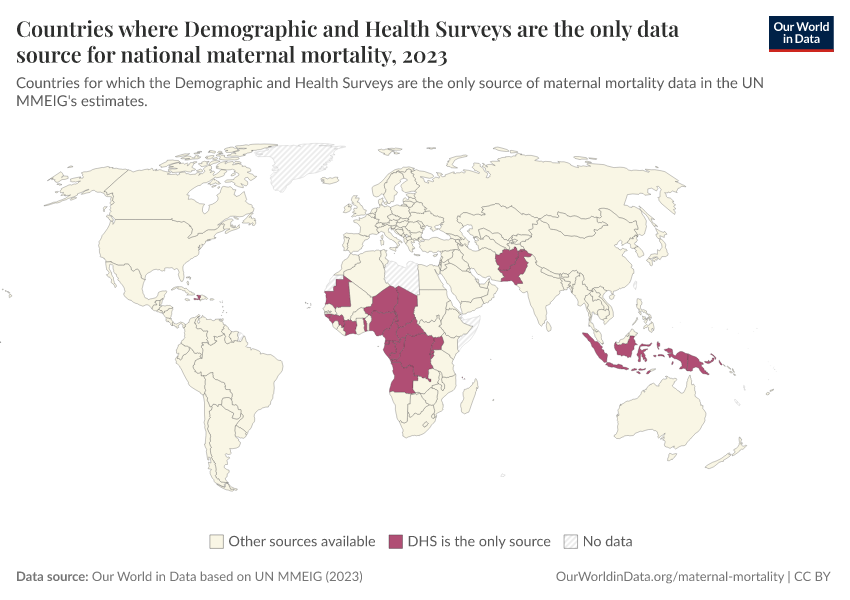 Our World in Data based on UN MMEIG (2023) – processed by Our World in Data. “Countries where Demographic and Health Surveys are the only data source for national maternal mortality” [dataset]. Our World in Data based on UN MMEIG, “Countries for which DHS is the only source for UN MMEIG maternal mortality estimates” [original data]. Retrieved March 11, 2026 from https://gdocs-bespoke-component.owid.pages.dev/grapher/dhs-is-the-only-source-of-maternal-mortality-data