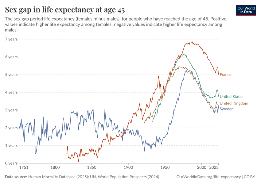 Human Mortality Database (2025); UN, World Population Prospects (2024) – with major processing by Our World in Data. “Life expectancy at 45 – HMD – female-male difference, period tables” [dataset]. Human Mortality Database, “Human Mortality Database”; United Nations, “World Population Prospects” [original data]. Retrieved March 11, 2026 from https://gdocs-bespoke-component.owid.pages.dev/grapher/difference-in-female-and-male-life-expectancy-at-age-45