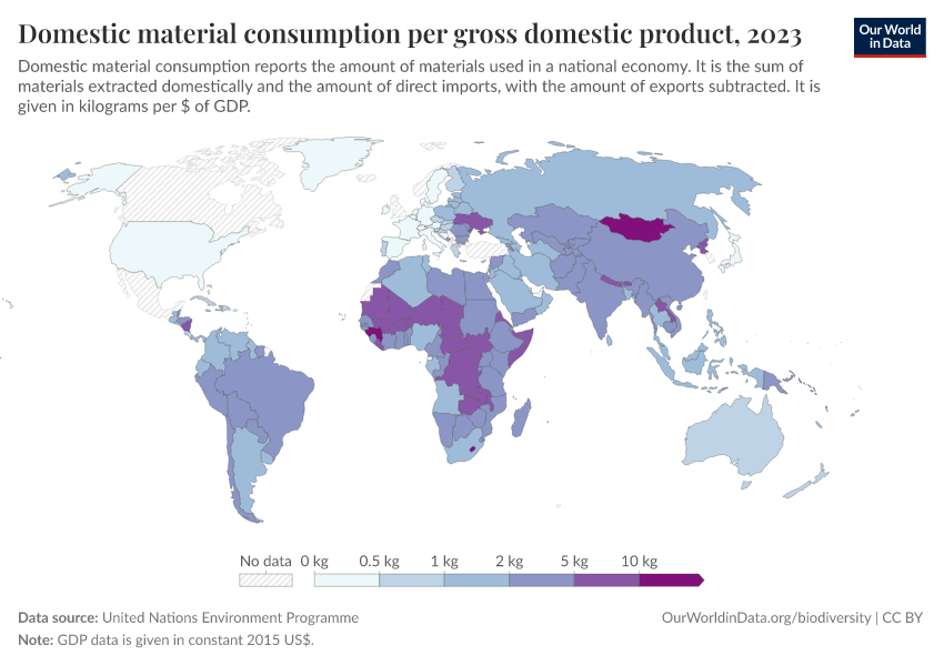 United Nations Environment Programme – processed by Our World in Data. “Domestic material consumption per gross domestic product” [dataset]. United Nations Environment Programme, “WESR / Global Material Flows Database” [original data]. Retrieved March 11, 2026 from https://gdocs-bespoke-component.owid.pages.dev/grapher/domestic-material-consumption-per-unit-of-gdp