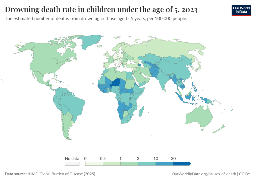 IHME, Global Burden of Disease (2025) – with major processing by Our World in Data. “Drowning death rate in children under the age of 5” [dataset]. IHME, Global Burden of Disease, “Global Burden of Disease - Deaths” [original data]. Retrieved March 11, 2026 from https://gdocs-bespoke-component.owid.pages.dev/grapher/drowning-death-rates-under-5