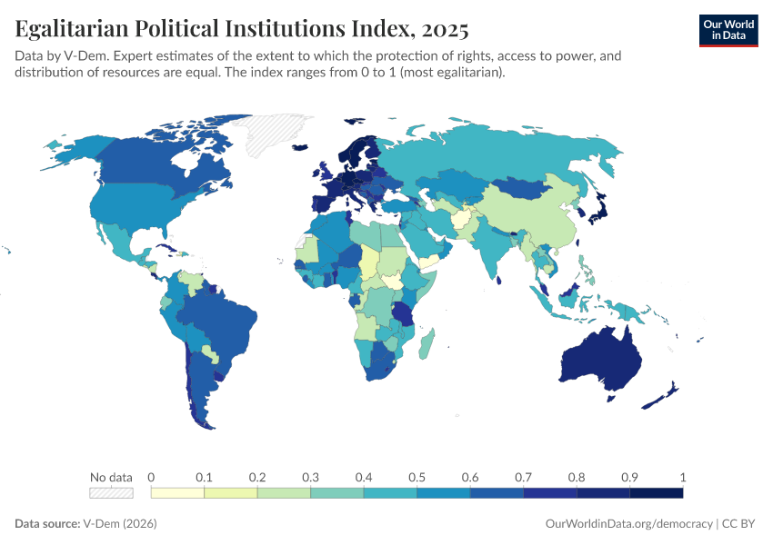 V-Dem (2025) – processed by Our World in Data. “Egalitarian political institutions index – V-Dem” [dataset]. V-Dem, “Democracy report v15” [original data]. Retrieved March 11, 2026 from https://gdocs-bespoke-component.owid.pages.dev/grapher/egalitarian-political-institutions-index