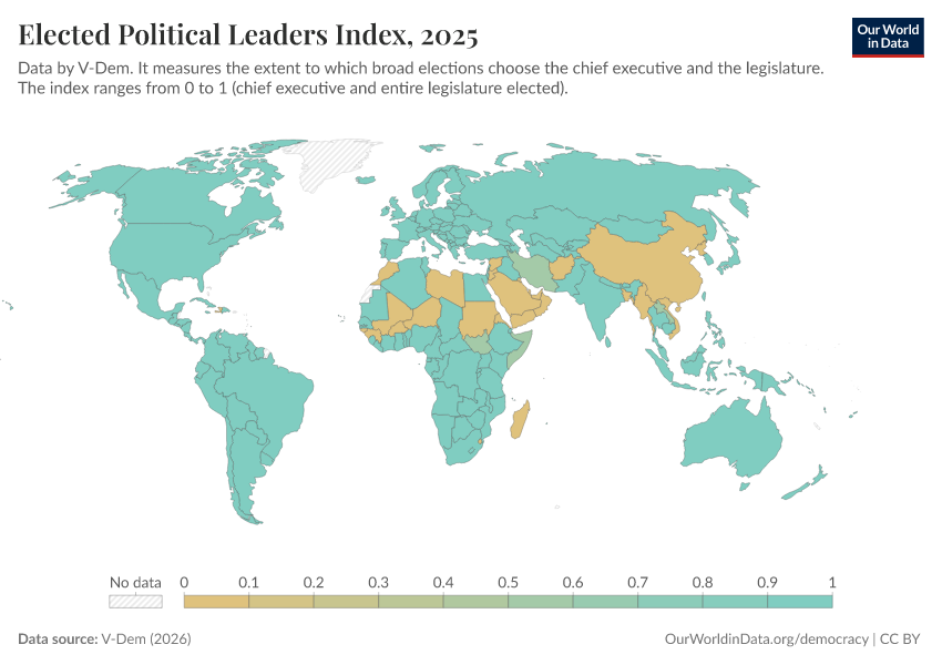V-Dem (2025) – processed by Our World in Data. “Elected officials index” [dataset]. V-Dem, “Democracy report v15” [original data]. Retrieved March 11, 2026 from https://gdocs-bespoke-component.owid.pages.dev/grapher/elected-political-leaders-index