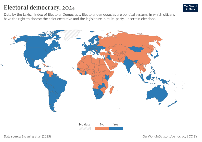Skaaning et al. (2025) – processed by Our World in Data. “Electoral democracy” [dataset]. Skaaning et al., “Lexical Index of Electoral Democracy (LIED) v6.8” [original data]. Retrieved March 11, 2026 from https://gdocs-bespoke-component.owid.pages.dev/grapher/electoral-democracy-lexical