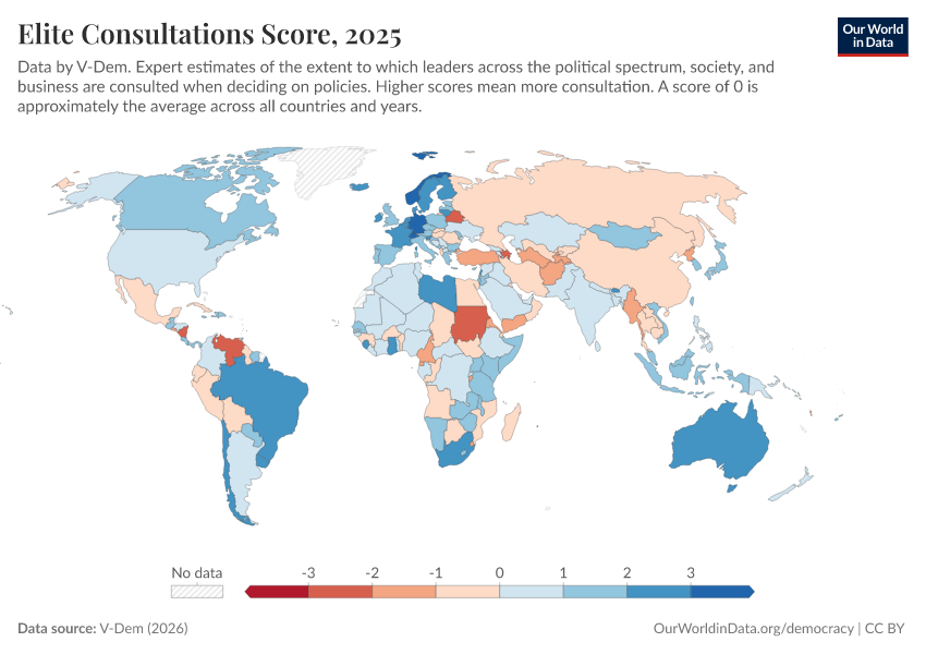 “Data Page: Elite consultation”, part of the following publication: Bastian Herre, Lucas Rodés-Guirao, and Esteban Ortiz-Ospina (2013) - “Democracy”. Data adapted from V-Dem. Retrieved from https://gdocs-bespoke-component.owid.pages.dev/grapher/elite-consultations-score [online resource]How to cite this data