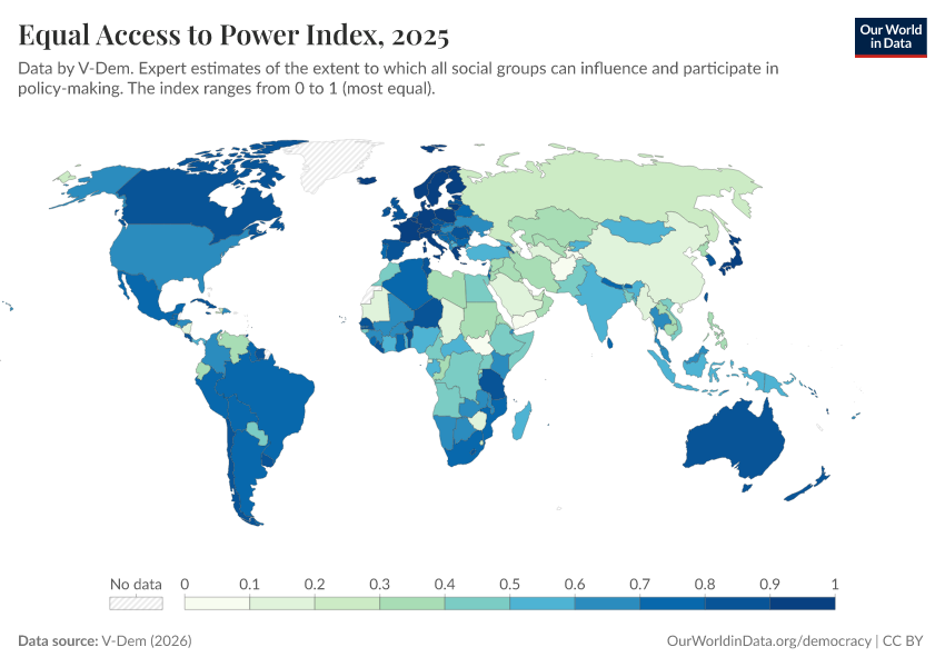 “Data Page: Equal access to power index”, part of the following publication: Bastian Herre, Lucas Rodés-Guirao, and Esteban Ortiz-Ospina (2013) - “Democracy”. Data adapted from V-Dem. Retrieved from https://gdocs-bespoke-component.owid.pages.dev/grapher/equal-access-to-power-index [online resource]How to cite this data