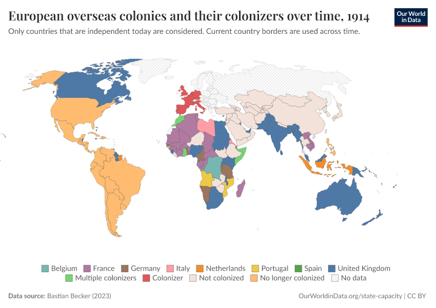 “Data Page: European overseas colonies and their colonizers over time”, part of the following publication: Bastian Herre and Pablo Arriagada (2023) - “State Capacity”. Data adapted from Bastian Becker. Retrieved from https://gdocs-bespoke-component.owid.pages.dev/grapher/european-overseas-colonies-and-their-colonizers [online resource]How to cite this data