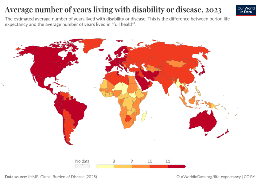 “Data Page: Average number of years living with disability or disease”, part of the following publication: Saloni Dattani, Lucas Rodés-Guirao, Hannah Ritchie, Esteban Ortiz-Ospina, and Max Roser (2023) - “Life Expectancy”. Data adapted from IHME, Global Burden of Disease. Retrieved from https://gdocs-bespoke-component.owid.pages.dev/grapher/expected-years-of-living-with-disability-or-disease-burden [online resource]How to cite this data