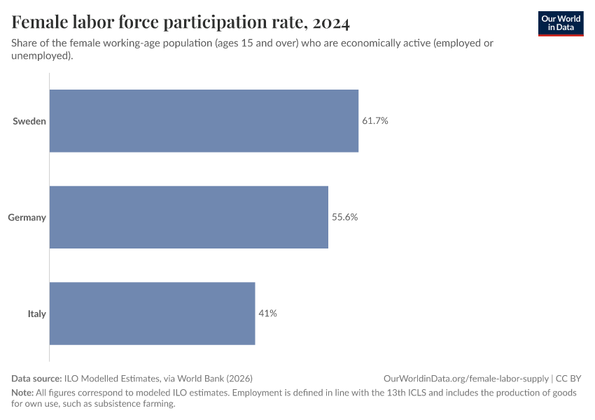 ILO Modelled Estimates, via World Bank (2026) – processed by Our World in Data. “Female labor force participation rate – ILO” [dataset]. ILO Modelled Estimates, via World Bank, “World Development Indicators 125” [original data]. Retrieved March 11, 2026 from https://gdocs-bespoke-component.owid.pages.dev/grapher/female-labor-force-participation-rates