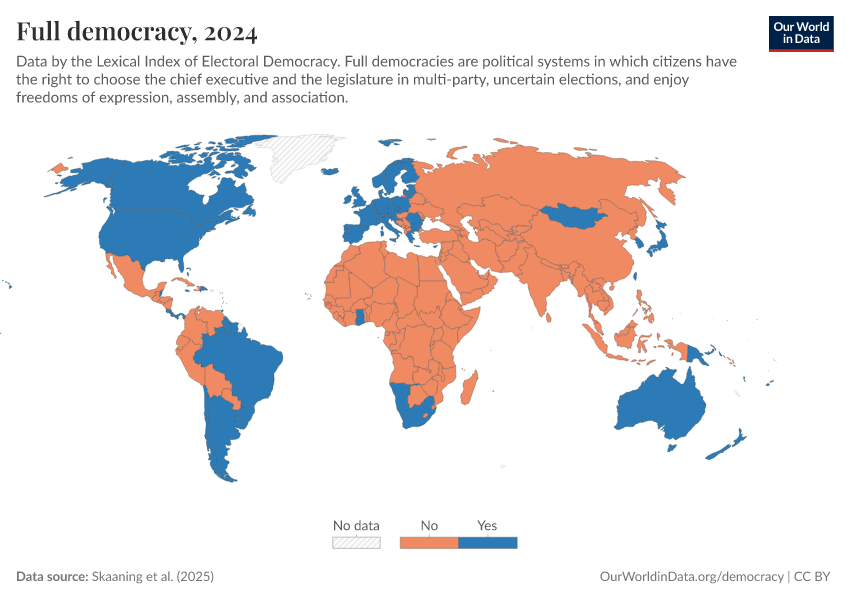Skaaning et al. (2025) – processed by Our World in Data. “Full democracy” [dataset]. Skaaning et al., “Lexical Index of Electoral Democracy (LIED) v6.8” [original data]. Retrieved March 11, 2026 from https://gdocs-bespoke-component.owid.pages.dev/grapher/full-democracy-lexical