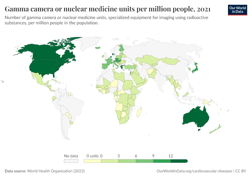 “Data Page: Gamma camera or nuclear medicine units per million people”, part of the following publication: Saloni Dattani, Veronika Samborska, Hannah Ritchie, and Max Roser (2023) - “Cardiovascular Diseases”. Data adapted from World Health Organisation. Retrieved from https://gdocs-bespoke-component.owid.pages.dev/grapher/gamma-camera-or-nuclear-medicine-availability [online resource]How to cite this data