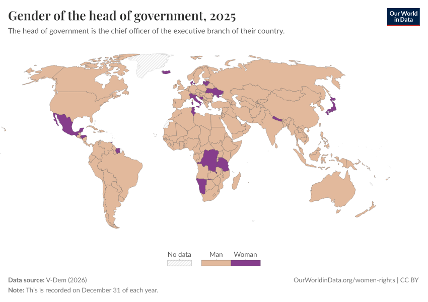 V-Dem (2025) – processed by Our World in Data. “Gender of the head of government” [dataset]. V-Dem, “Democracy report v15” [original data]. Retrieved March 11, 2026 from https://gdocs-bespoke-component.owid.pages.dev/grapher/gender-of-the-head-of-government
