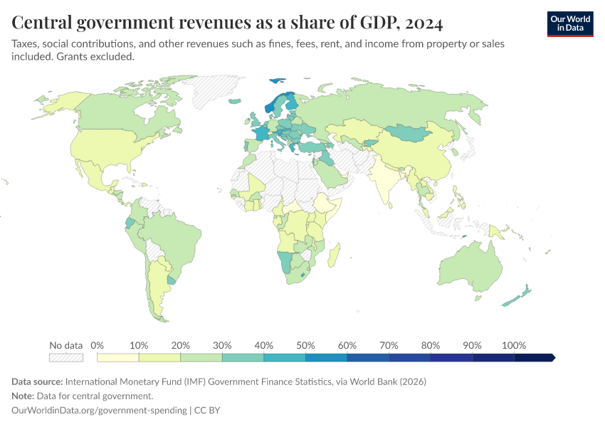 “Data Page: Central government revenues as a share of GDP”. Our World in Data (2026). Data adapted from International Monetary Fund (IMF) Government Finance Statistics, via World Bank. Retrieved from https://gdocs-bespoke-component.owid.pages.dev/grapher/government-revenues-as-a-share-of-gdp-world-bank [online resource]How to cite this data