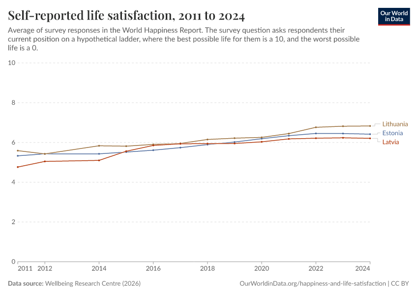 Wellbeing Research Centre (2025) – with major processing by Our World in Data. “Self-reported life satisfaction” [dataset]. Wellbeing Research Centre, “World Happiness Report 2025” [original data]. Retrieved March 11, 2026 from https://gdocs-bespoke-component.owid.pages.dev/grapher/happiness-cantril-ladder