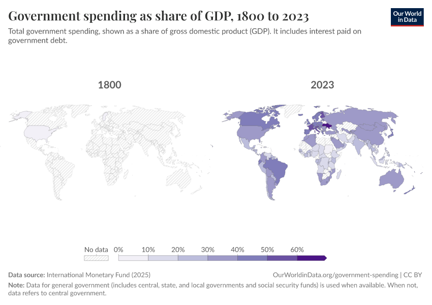 International Monetary Fund (2025) – with minor processing by Our World in Data. “Government spending as share of GDP” [dataset]. International Monetary Fund, “Public Finances in Modern History” [original data]. Retrieved March 11, 2026 from https://gdocs-bespoke-component.owid.pages.dev/grapher/historical-gov-spending-gdp