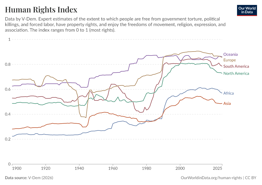 V-Dem (2025) – processed by Our World in Data. “Human rights index – V-Dem” [dataset]. V-Dem, “Democracy report v15” [original data]. Retrieved March 11, 2026 from https://gdocs-bespoke-component.owid.pages.dev/grapher/human-rights-index-vdem