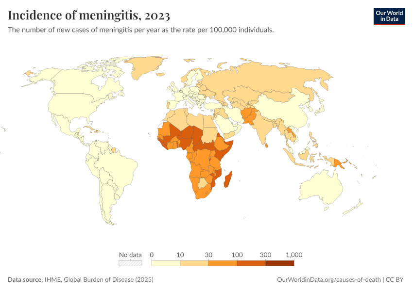 “Data Page: Incidence of meningitis”, part of the following publication: Esteban Ortiz-Ospina and Max Roser (2016) - “Global Health”. Data adapted from IHME, Global Burden of Disease. Retrieved from https://gdocs-bespoke-component.owid.pages.dev/grapher/incidence-of-meningitis [online resource]How to cite this data