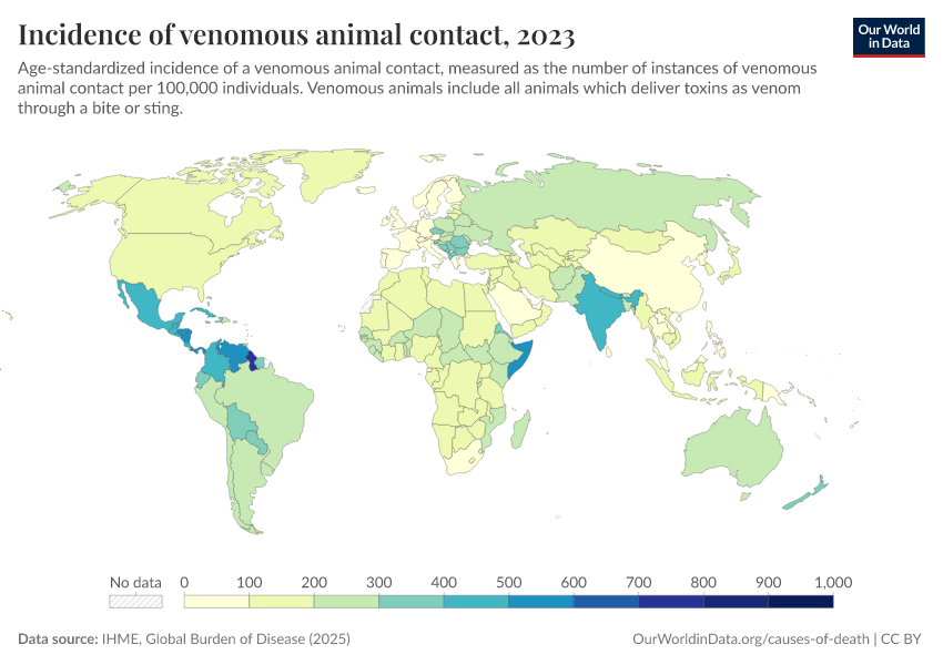 IHME, Global Burden of Disease (2025) – with major processing by Our World in Data. “Incidence of venomous animal contact” [dataset]. IHME, Global Burden of Disease, “Global Burden of Disease - Prevalence and Incidence” [original data]. Retrieved March 11, 2026 from https://gdocs-bespoke-component.owid.pages.dev/grapher/incidence-of-venomous-animal-contact