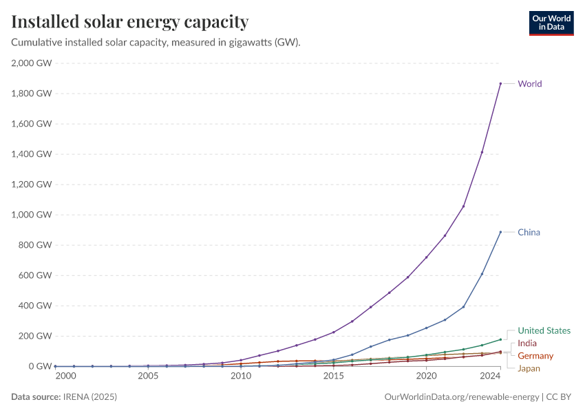 IRENA (2025) – processed by Our World in Data. “Total solar capacity” [dataset]. IRENA, “Renewable Energy Statistics” [original data]. Retrieved March 11, 2026 from https://gdocs-bespoke-component.owid.pages.dev/grapher/installed-solar-pv-capacity