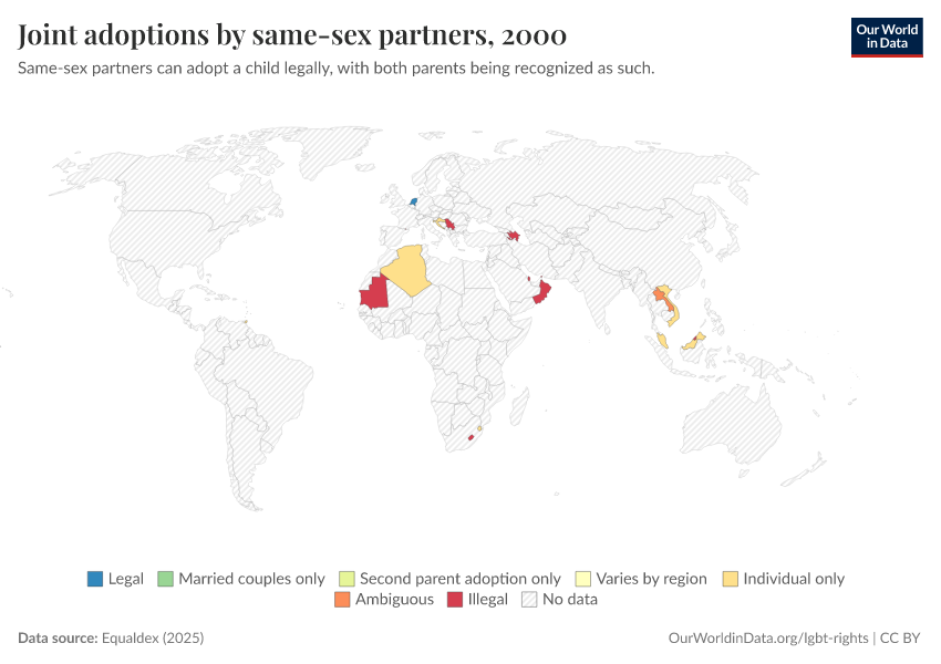 “Data Page: Joint adoptions by same-sex partners”, part of the following publication: Bastian Herre and Pablo Arriagada (2023) - “LGBT+ Rights”. Data adapted from Equaldex. Retrieved from https://gdocs-bespoke-component.owid.pages.dev/grapher/joint-adoptions-same-sex-partners-equaldex [online resource]How to cite this data