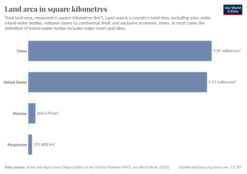Food and Agriculture Organization of the United Nations (FAO), via World Bank (2026) – processed by Our World in Data. “Land area in square kilometres” [dataset]. Food and Agriculture Organization of the United Nations (FAO), via World Bank, “World Development Indicators 125” [original data]. Retrieved March 11, 2026 from https://gdocs-bespoke-component.owid.pages.dev/grapher/land-area-km