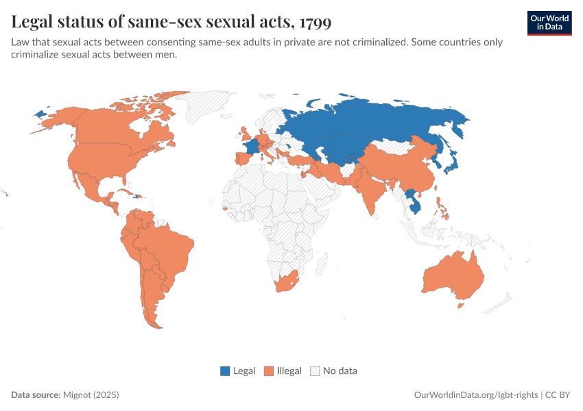“Data Page: Legal status of same-sex sexual acts”, part of the following publication: Bastian Herre and Pablo Arriagada (2023) - “LGBT+ Rights”. Data adapted from Mignot. Retrieved from https://gdocs-bespoke-component.owid.pages.dev/grapher/legal-status-of-same-sex-sexual-acts [online resource]How to cite this data