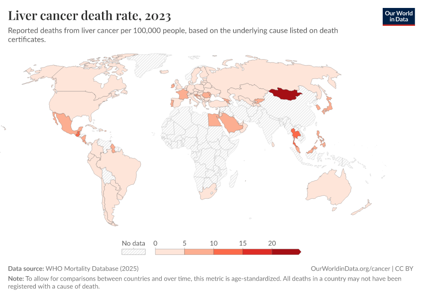WHO Mortality Database (2025) – with minor processing by Our World in Data. “Liver cancer death rate” [dataset]. WHO Mortality Database, “WHO Mortality Database” [original data]. Retrieved March 11, 2026 from https://gdocs-bespoke-component.owid.pages.dev/grapher/liver-cancer-death-rate