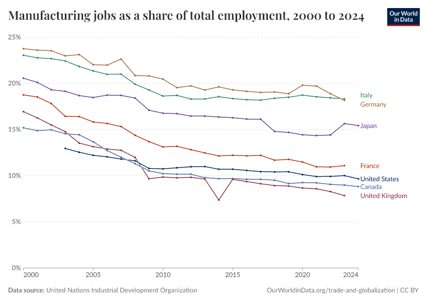 “Data Page: Manufacturing jobs as a share of total employment”. Our World in Data (2026). Data adapted from United Nations Industrial Development Organization. Retrieved from https://gdocs-bespoke-component.owid.pages.dev/grapher/manufacturing-share-of-total-employment [online resource]How to cite this data