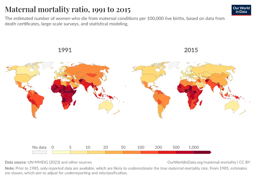 “Data Page: Maternal mortality ratio”, part of the following publication: Max Roser and Hannah Ritchie (2013) - “Maternal Mortality”. Data adapted from UN MMEIG (WHO, UNICEF, UNFPA, World Bank Group and UNDESA/ Population Division), WHO Mortality Database, United Nations, Gapminder. Retrieved from https://gdocs-bespoke-component.owid.pages.dev/grapher/maternal-mortality [online resource]How to cite this data