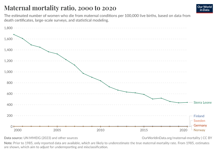 “Data Page: Maternal mortality ratio”, part of the following publication: Max Roser and Hannah Ritchie (2013) - “Maternal Mortality”. Data adapted from UN MMEIG (WHO, UNICEF, UNFPA, World Bank Group and UNDESA/ Population Division), WHO Mortality Database, United Nations, Gapminder. Retrieved from https://gdocs-bespoke-component.owid.pages.dev/grapher/maternal-mortality [online resource]How to cite this data