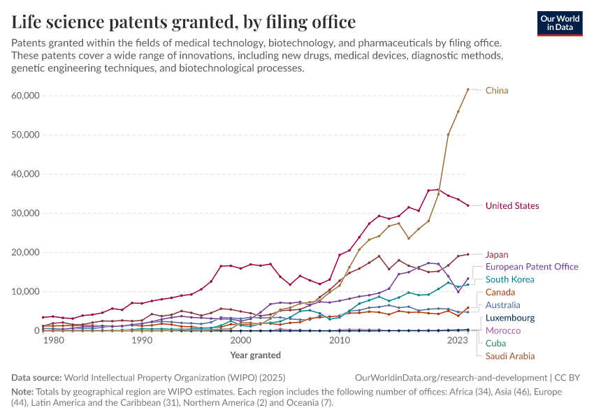 “Data Page: Life science patents granted, by filing office”, part of the following publication: Tuna Acisu, Saloni Dattani, Fiona Spooner, Veronika Samborska, Hannah Ritchie, and Max Roser (2025) - “Medicine and Biotechnology”. Data adapted from World Intellectual Property Organization (WIPO). Retrieved from https://gdocs-bespoke-component.owid.pages.dev/grapher/medicine-and-biotechnology-patents-granted-by-filing-office [online resource]How to cite this data