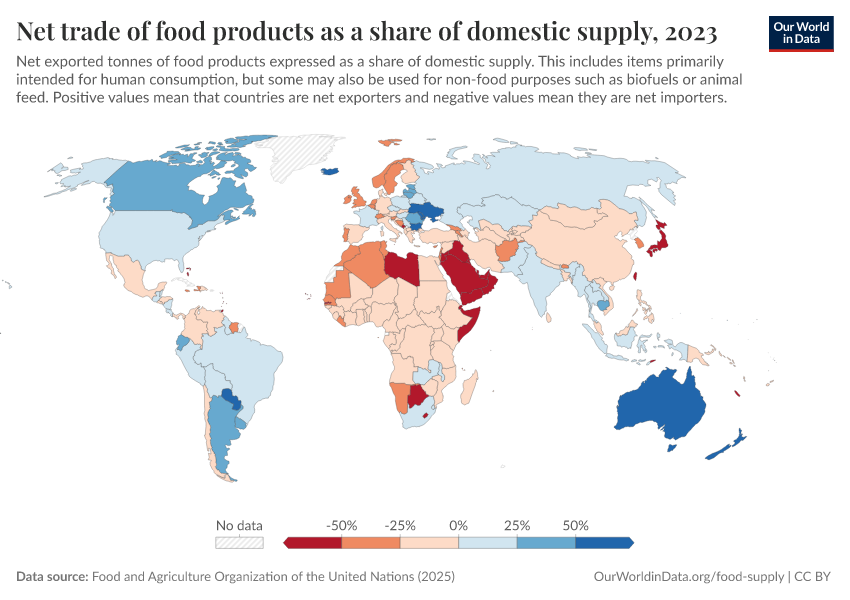 “Data Page: Net trade of food products as a share of domestic supply”, part of the following publication: Hannah Ritchie, Pablo Rosado, and Max Roser (2023) - “Agricultural Production”. Data adapted from Food and Agriculture Organization of the United Nations. Retrieved from https://gdocs-bespoke-component.owid.pages.dev/grapher/net-food-trade-as-a-share-of-domestic-supply [online resource]How to cite this data