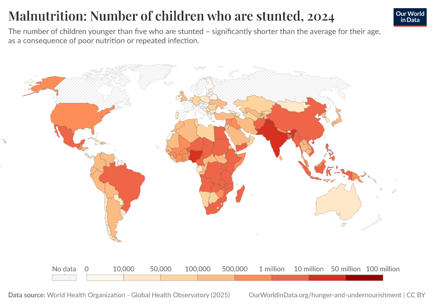 “Data Page: Malnutrition: Number of children who are stunted”. Our World in Data (2026). Data adapted from World Health Organization. Retrieved from https://gdocs-bespoke-component.owid.pages.dev/grapher/number-children-stunted-who [online resource]How to cite this data