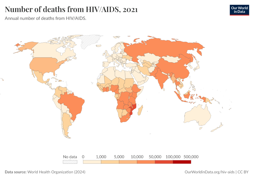 World Health Organization (2024) – with major processing by Our World in Data. “Number of deaths from HIV/AIDS” [dataset]. World Health Organization, “Global Health Estimates” [original data]. Retrieved March 11, 2026 from https://gdocs-bespoke-component.owid.pages.dev/grapher/number-of-deaths-from-hivaids-who