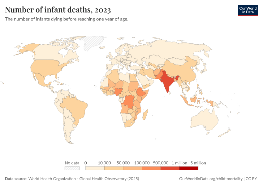 World Health Organization - Global Health Observatory (2025) – processed by Our World in Data. “Number of infant deaths” [dataset]. World Health Organization, “Global Health Observatory” [original data]. Retrieved March 11, 2026 from https://gdocs-bespoke-component.owid.pages.dev/grapher/number-of-infant-deaths-gho