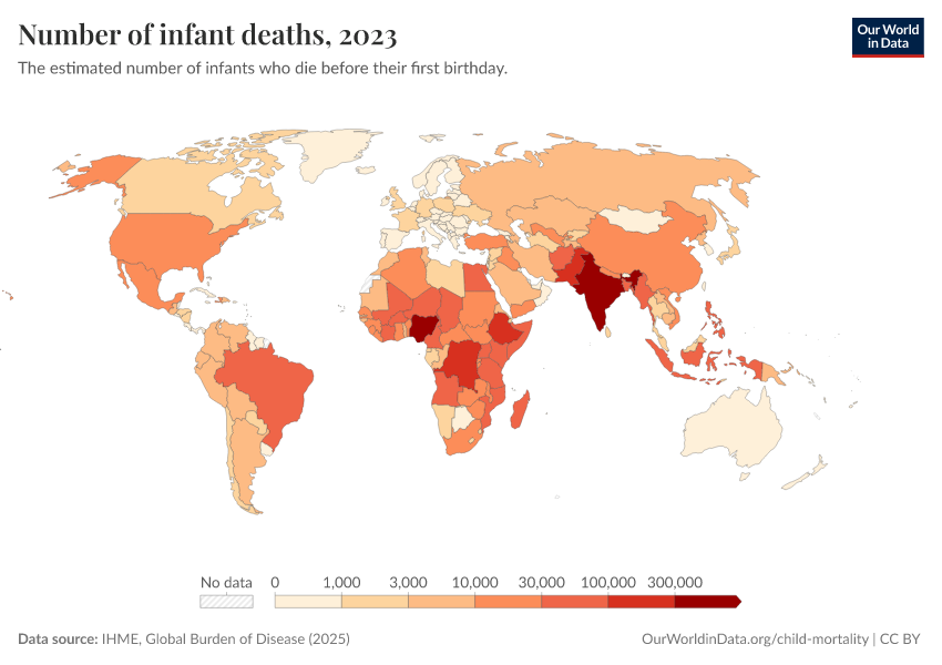 IHME, Global Burden of Disease (2025) – with minor processing by Our World in Data. “Number of infant deaths” [dataset]. IHME, Global Burden of Disease, “Global Burden of Disease - Child Mortality” [original data]. Retrieved March 11, 2026 from https://gdocs-bespoke-component.owid.pages.dev/grapher/number-of-infant-deaths-ihme