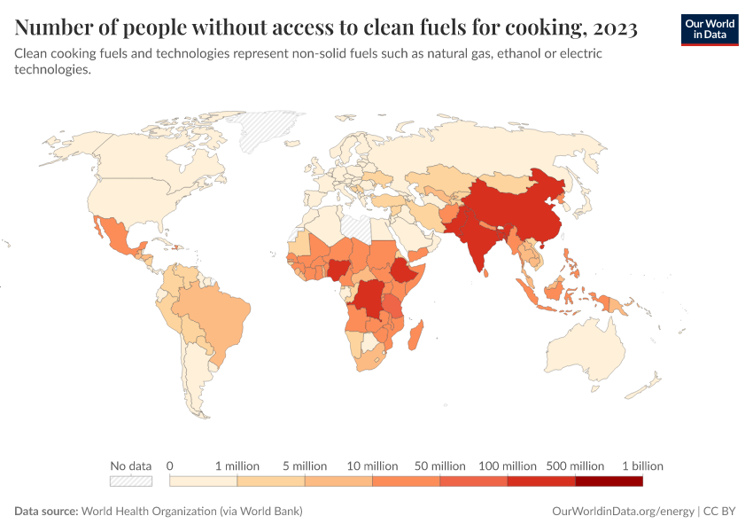 “Data Page: Number of people without access to clean fuels for cooking”, part of the following publication: Hannah Ritchie, Pablo Rosado, and Max Roser (2019) - “Access to Energy”. Data adapted from Tracking SDG 7: The Energy Progress Report, via World Bank, United Nations Population Division, national statistical offices, and Eurostat, via World Bank. Retrieved from https://gdocs-bespoke-component.owid.pages.dev/grapher/number-without-clean-cooking-fuel [online resource]How to cite this data