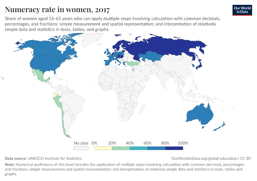 “Data Page: Numeracy rate in women”. Our World in Data (2026). Data adapted from UNESCO Institute for Statistics. Retrieved from https://gdocs-bespoke-component.owid.pages.dev/grapher/numeracy-rate-in-adult-women-sdg [online resource]How to cite this data