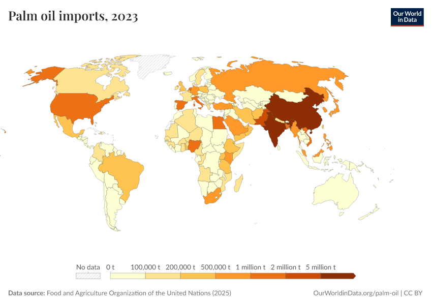 Food and Agriculture Organization of the United Nations (2025) – processed by Our World in Data. “Imports of palm oil” [dataset]. Food and Agriculture Organization of the United Nations, “Food Balances: Food Balances (-2013, old methodology and population)”; Food and Agriculture Organization of the United Nations, “Food Balances: Food Balances (2010-)” [original data]. Retrieved March 11, 2026 from https://gdocs-bespoke-component.owid.pages.dev/grapher/palm-oil-imports