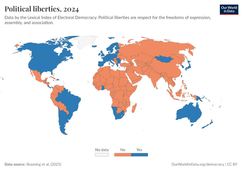 Skaaning et al. (2025) – processed by Our World in Data. “Political liberties” [dataset]. Skaaning et al., “Lexical Index of Electoral Democracy (LIED) v6.8” [original data]. Retrieved March 11, 2026 from https://gdocs-bespoke-component.owid.pages.dev/grapher/political-liberties-lexical