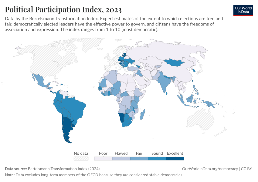 “Data Page: Political Participation Index”, part of the following publication: Bastian Herre, Lucas Rodés-Guirao, and Esteban Ortiz-Ospina (2013) - “Democracy”. Data adapted from Bertelsmann Transformation Index. Retrieved from https://gdocs-bespoke-component.owid.pages.dev/grapher/political-participation-index-bti [online resource]How to cite this data