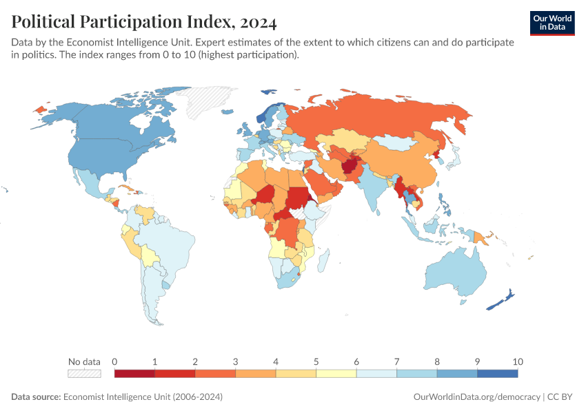 Economist Intelligence Unit (2006-2024) – processed by Our World in Data. “Political Participation Index” [dataset]. Economist Intelligence Unit, “Democracy Index 2021: The China challenge”; Economist Intelligence Unit, “Democracy Index 2022: Frontline democracy and the battle for Ukraine”; Economist Intelligence Unit, “Democracy Index 2023: Age of Conflict”; Economist Intelligence Unit, “Democracy Index 2024: What's wrong with representative democracy?”; Gapminder, “Democracy Index v4”; Various sources, “Population” [original data]. Retrieved March 11, 2026 from https://gdocs-bespoke-component.owid.pages.dev/grapher/political-participation-index-eiu