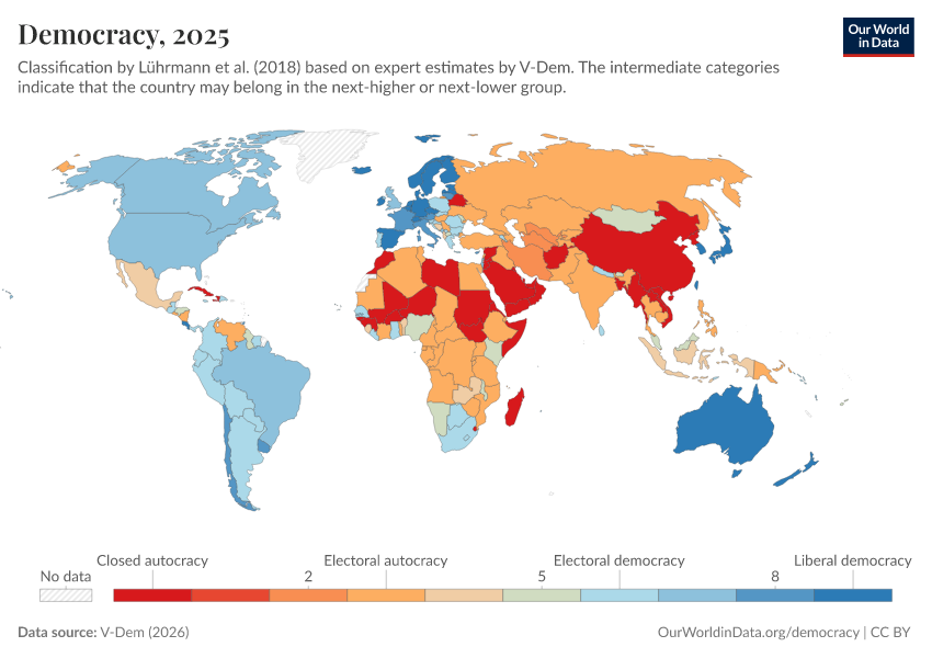 V-Dem (2025) – processed by Our World in Data. “Political regime – inc. ambiguous categories” [dataset]. V-Dem, “Democracy report v15” [original data]. Retrieved March 11, 2026 from https://gdocs-bespoke-component.owid.pages.dev/grapher/political-regime-amb-row