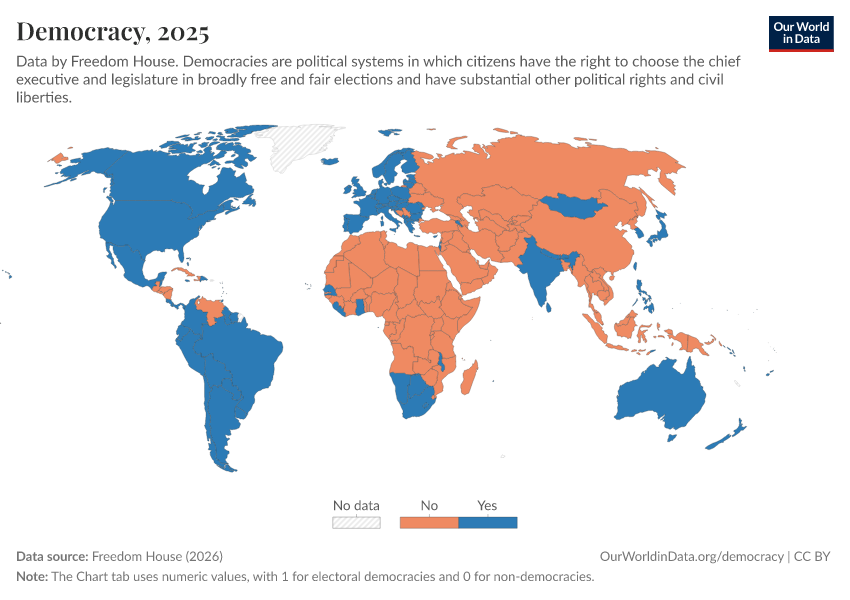 Freedom House (2025) – processed by Our World in Data. “Democracy” [dataset]. Freedom House, “Freedom in the World” [original data]. Retrieved March 11, 2026 from https://gdocs-bespoke-component.owid.pages.dev/grapher/political-regime-dem-fh
