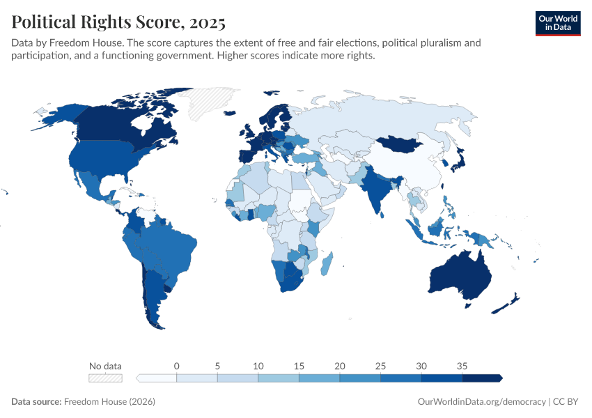 Freedom House (2025) – processed by Our World in Data. “Political Rights Score” [dataset]. Freedom House, “Freedom in the World” [original data]. Retrieved March 11, 2026 from https://gdocs-bespoke-component.owid.pages.dev/grapher/political-rights-score-fh