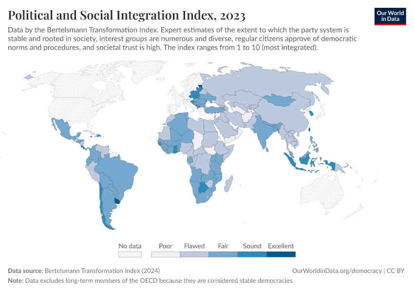 “Data Page: Political and Social Integration Index”, part of the following publication: Bastian Herre, Lucas Rodés-Guirao, and Esteban Ortiz-Ospina (2013) - “Democracy”. Data adapted from Bertelsmann Transformation Index. Retrieved from https://gdocs-bespoke-component.owid.pages.dev/grapher/political-social-integration-index-bti [online resource]How to cite this data