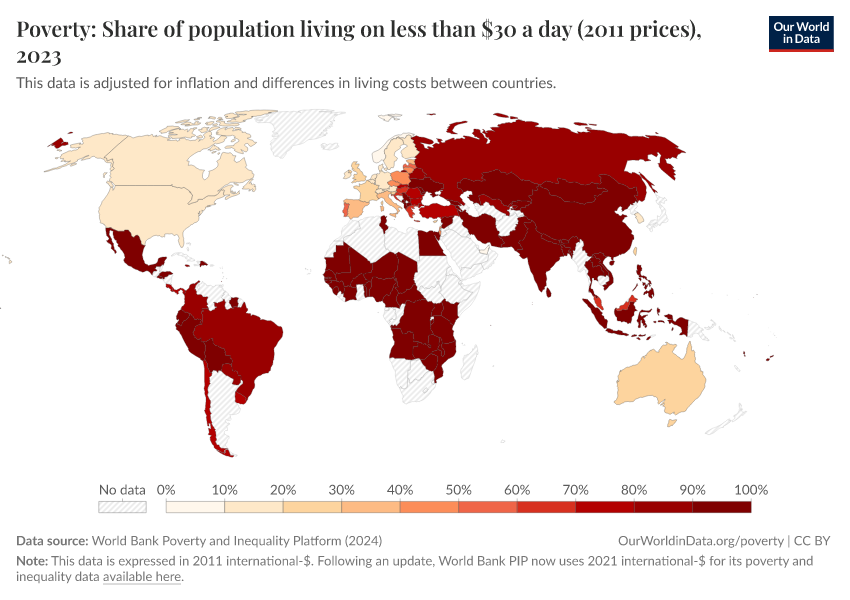 World Bank Poverty and Inequality Platform (2024) – with major processing by Our World in Data. “Poverty: Share of population living on less than $30 a day (2011 prices) – World Bank” [dataset]. World Bank Poverty and Inequality Platform, “World Bank Poverty and Inequality Platform (PIP) 20240627_2017, 20240627_2011” [original data]. Retrieved March 11, 2026 from https://gdocs-bespoke-component.owid.pages.dev/grapher/poverty-share-on-less-than-30-per-day-2011-ppp