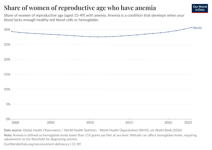 Global Health Observatory / World Health Statistics - World Health Organization (WHO), via World Bank (2026) – processed by Our World in Data. “Share of women of reproductive age who have anemia” [dataset]. Global Health Observatory / World Health Statistics - World Health Organization (WHO), via World Bank, “World Development Indicators 125” [original data]. Retrieved March 11, 2026 from https://gdocs-bespoke-component.owid.pages.dev/grapher/prevalence-of-anemia-in-women-of-reproductive-age-aged-15-29