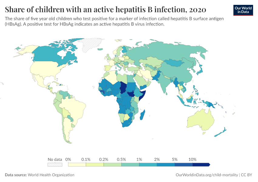 “Data Page: Share of children with an active hepatitis B infection”. Our World in Data (2026). Data adapted from World Health Organization. Retrieved from https://gdocs-bespoke-component.owid.pages.dev/grapher/prevalence-of-hepatitis-b-surface-antigen [online resource]How to cite this data